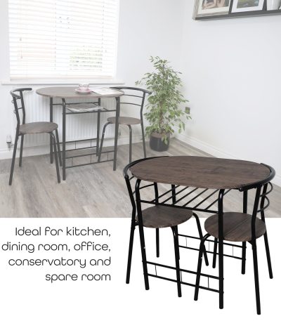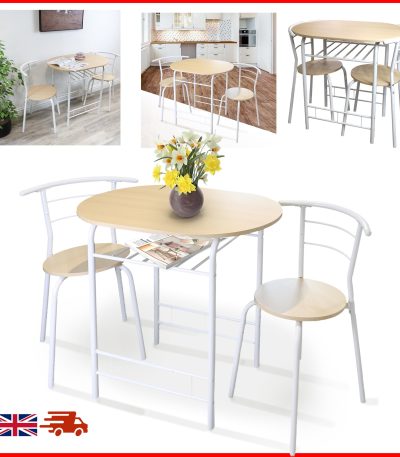 £55.99LWS 3-Piece Sapce-Saving Wooden Round Table & Chair Set for Kitchen, Dining Room. Space-Saving Design: This dining set is functional yet unobtrusive, with chairs that fit perfectly to the table’s edges to make it perfect for any kitchen, dining room, or living room. Built-In Storage: Designed with a multipurpose lower shelf perfect for holding wine, food trays, and more directly under the frame. Ergonomic Backrest: Chairs are designed with a curved backrest to promote a healthy, comfortable posture; high quality also includes a 330-pound weight capacity per chair. Sturdy Construction: The tabletop and seats are built with durable engineered wood, both with solid iron frames, which makes them reliable sets that last for years to come. The dimensions of the table are 80 L x 53 W x 74 H cm and the dimensions of the chairs are 35 L x 35 W x 74 H cm.